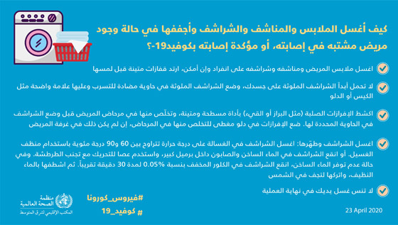 في تظل تفشي فيروس كورونا المستجد، مسجلاً أكثر من 8 ملايين إصابة حول العالم، لا بد من توخي الحذر في جميع الأمور اليومية تفادياً لخطر الوباء. بدورها، تنشر منظمة الصحة العالمية بين الحين والآخر نصائح عبر منصاتها، لجميع الأفراد كي يستفيدوا منها للتأقلم والتعامل مع الوضع الحالي، ريثما يتوصل الخبراء والعلماء إلى لقاح شاف وعلاج واق. والجديد اليوم نشرته المنظمة عبر حسابها في تويتر، وتضمّن نصائح لمن كان في بيته مصاب كورونا. ونشرت الصحة تعليمات يجب اتباعها عند غسل ملابس ومناشف وشراشف المصاب بطرق آمنة في المنزل.