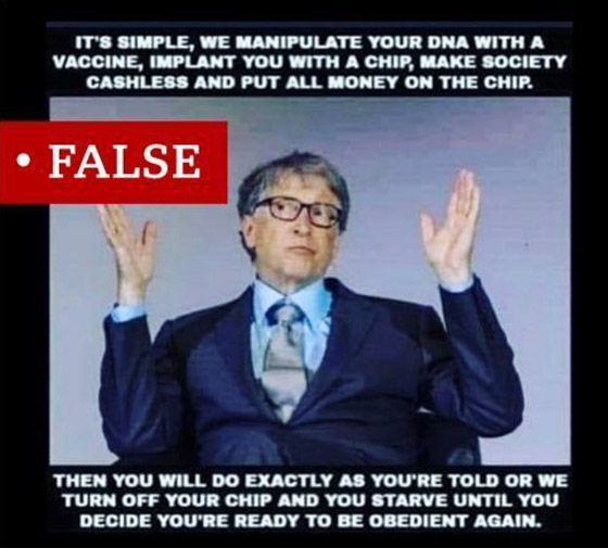 ومن بين أكثر المزاعم انتشاراً هذا الأسبوع، واحد كان قد تم تدواله في مطلع العام، مفاده أن وباء كورونا غطاء لخطة تهدف لزرع شرائح إلكترونية دقيقة يمكن تتبعها داخل أجسام الناس، وأن بيل غيتس يقف وراء كل ذلك. ولا يوجد دليل يؤيد تلك المزاعم، كما أن مؤسسة بيل ومليندا غيتس أكدت أنها عارية عن الصحة.