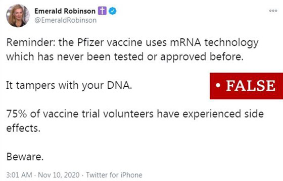 نصحت مراسلة موقع نيوماكس الموالي للرئيس الأمريكي دونالد ترامب متابعيها على تويتر وعددهم 264 ألفا بأن "يحذروا" اللقاح الذي تطوره شركتا فايزر وبيونتيك للأدوية. وزعمت إميرالد روبينسون في تغريدتها أن اللقاح "يعبث في الحمض النووي". وكان الخوف بشأن تغيير الحمض النووي بشكل أو بآخر أمراً لاحظناه بشكل معتاد في منشورات على موقع فيسبوك.