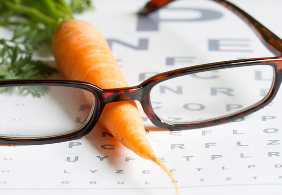 المكسرات غنية أيضًا بأحماض أوميجا 3 الدهنية، وتحتوي على الكثير من فيتامين (هـ) الذي يمكن أن يحمي العين من الأضرار المرتبطة بالعمر. ثمار الحمضيات غنية بفيتامين C وهو أحد مضادات الأكسدة الموصى بها لمحاربة تلف العين المرتبط بالعمر أيضًا. والجزر غني بفيتامين أ وبيتا كاروتين. ويلعب فيتامين أ دورًا أساسيًا في الرؤية.