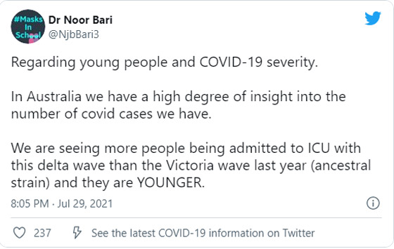 فيما استشهد موقع استرالي بواقعة الموت المأساوي قبل أيام، لشابٍ يبلغ من العمر 27 عاماً من مدينة سيدني الأسترالية كان مصاباً بفيروس كوفيد-19، وذلك في أعقاب وفاة امرأة تبلغ من العمر 38 عاماً، متأثِّرة بالفيروس خلال الشهر الماضي. الموقع أشار إلى أن الفئة العمرية من 30 إلى 49 عاماً مثَّلَت أكبر عددٍ من حالات الاستشفاء من كوفيد-19، حيث قُبِلَ 45 شخصاً في الثلاثينيات والأربعينيات من العمر (26% من إجمالي حالات دخول المستشفيات بسبب كوفيد)، وذلك في ولاية نيو ساوث ويلز الأسترالية، بين 13 يونيو/حزيران و17 يوليو/تموز. فقد قُبِلَ نحو 13 شخصاً يبلغون من العمر 49 عاماً أو أقل في وحدة العناية المركِّزة، وهو ما يمثِّل 36% من إجمالي المقبولين في وحدة العناية المركَّزة، وكان أصغرهم مراهقاً.