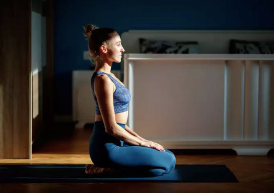 اركع على السجادة مع وضع الركبتين معًا وأرح راحة اليد على الفخذين. تأكد من أن قدميك بعيدتان قليلاً عن بعضهما البعض. اجلس بين ربلتيك واسحب قدميك بالقرب من الأرداف، مع الحفاظ على عمودك الفقري منتصبًا. مدّ ذراعيك للخارج وضع راحتي يديك على ركبتيك. اجلس في هذا الوضع لمدة دقيقتين وقم بزيادة التوقيت تدريجيًا.