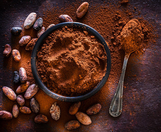 1- الكاكاو: الكاكاو في شكله النقي له طعم مرّ، ولكنه غنى بالفوائد الصحية، إلى جانب تنشيط عصارة الجهاز الهضمي، فالكاكاو مليء بالعناصر الغذائية بما في ذلك المغنيسيوم والبوتاسيوم والحديد والزنك، كما أنه يحتوي على نسبة عالية من الفلافونويد، وهو نوع من مادة البوليفينول وهو ذو فوائد رائعة للدماغ.