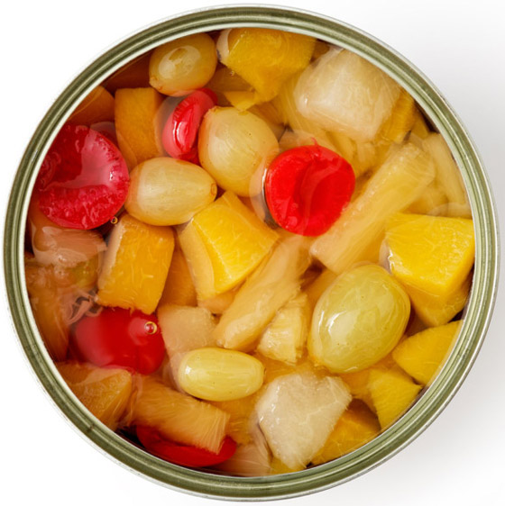 تحتوي جميع الفاكهة على سكريات طبيعية إلا أن الفاكهة المعلبة يتم حفظها في شراب سكري؛ للحفاظ عليها مدة طويلة. تجرد هذه المعالجة الألياف من الفاكهة وتضيف كثيراً من السكر غير الضروري إلى ما يفترض أن يكون وجبة خفيفة صحية. لتجنب السكر الزائد، من الأفضل تناول الفاكهة الكاملة والطازجة. أما إذا كنت مضطراً إلى تناول الفاكهة المعلبة، فابحث عن الفاكهة المحفوظة في العصير بدلاً من الشراب السكري.