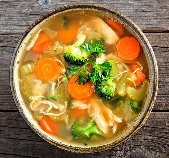 4- شوربة الدجاج: لأنه يملك خصائص مضادة للالتهابات تعمل على المساعدة في تخفيف الأعراض التي تأتي مع مكافحة المرض، خاصة إذا كانت تحتوي على قطع الجزر والبصل والكرفس، وكل منهم يوفر المعادن الأساسية مثل البوتاسيوم والحديد، وهي مصادر رائعة للبيتا كاروتين، وهو أحد أشكال فيتامين A الذي يعمل كمضاد للأكسدة، وبالإضافة إلى ذلك، يوفر الدجاج حصة كبيرة من البروتين، مما يساعد على تشغيل الأجسام المضادة والحفاظ على عمل الجهاز المناعي بكفاءة.