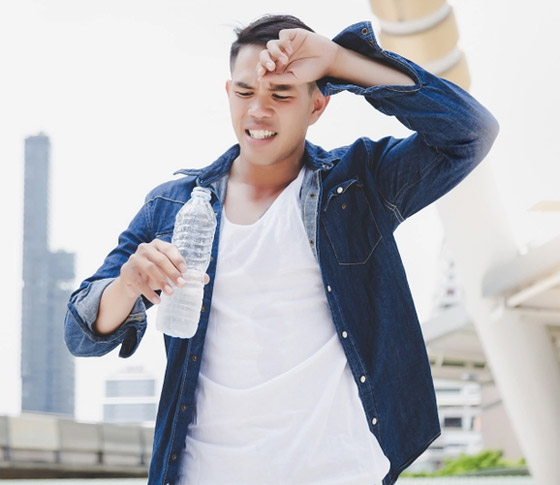 1- الجفاف: يحدث الجفاف عندما يفتقر الجسم إلى الكمية المناسبة من السوائل لكي يعمل بشكل صحيح. ويُعد الجفاف الشديد خطراً حقيقياً يهدد الحياة، خاصة بالنسبة للرضع والأطفال الصغار. ويمكن أن يكون سبب الجفاف هو المرض أو التعرُّق الغزير أو كثرة التبول أو القيء أو الإسهال.