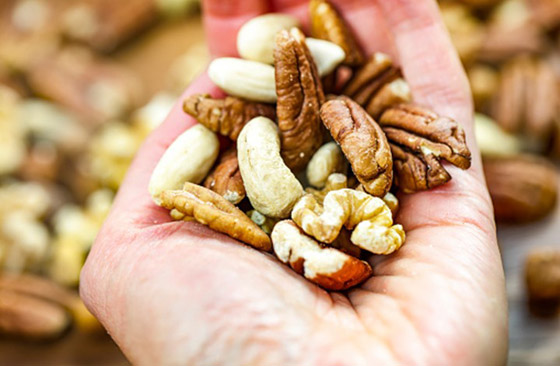 وبالإضافة إلى الدهون الصحية، تحتوي المكسرات أيضاً على الكثير من المواد النباتية الثانوية والألياف والفيتامينات والمعادن والعناصر النزرة، كما أنها تمثل مصادر جيدة للبروتين. ونتيجة لذلك، فإنها تساعد على الشعور بالشبع لمدة طويلة، ومن ثم تمنع نوبات الجوع الشديدة، مما يساعد في إنقاص الوزن والتمتع بالرشاقة.