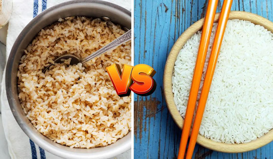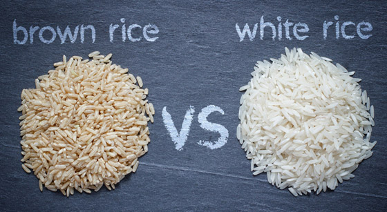 يتكون الأرز بالكامل من الكربوهيدرات ويحتوي على القليل من البروتين. ولكن وفقًا لموقع أمريكي صحي، يحتوي الأرز البني على أجزاء من حبة الأرز أكثر من الأرز الأبيض، حيث إن الأرز البني عبارة عن حبة كاملة، مما يعني أن حبة الأرز البني تشتمل على النخالة الليفية والبذرة بينما لا تحتوي حبة الأرز الأبيض عليهما. وتجعل النخالة والبذرة الأرز البني أضخم قليلاً وتمنحانه قوامًا أكثر مضغًا. كما أنهما السبب في أن طهي الأرز البني يستغرق وقتًا أطول قليلاً مما يستغرقه الأبيض.