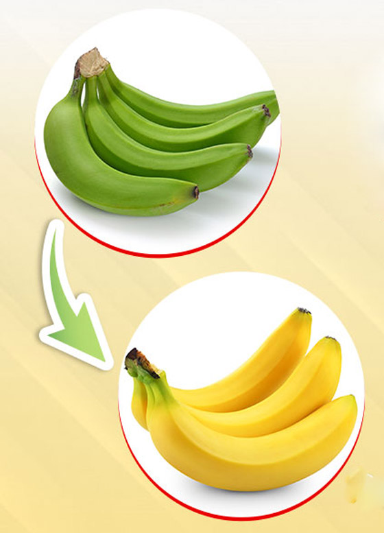 1. التخزين مع فواكه عالية إنتاج الإيثيلين: تقول جينيفر باليان، حاصلة على بكالوريوس العلوم واختصاصية تغذية إن "غاز الإيثيلين يُنتج عن طريق الموز نفسه ويظهر بتركيزات أعلى عندما يصل الموز إلى ذروة النضج. وعند وجود غاز الإيثيلين من الفاكهة الناضجة بالفعل، ينتج الموز إنزيمات تكسر جدران الخلايا، مما ينتج عنه لحم أكثر ليونة وحيوية ونكهة أحلى". وتشمل الفواكه عالية إنتاج الإيثيلين التفاح والأفوكادو والطماطم والبطيخ والشمام، لذا فإنه "بشكل عام، يمكن أن يكون وضع الموز الأخضر إلى جانب حبة أو اثنتين من التفاح أو الطماطم كافية لبدء عملية الإنضاج".