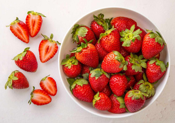6. الفراولة: تتميز الفراولة بأنها مرطبة ومنعشة، إذ تحتوي على 91.6% من الماء وهي قليلة السعرات الحرارية. بالإضافة إلى أن كل كوب منها يحتوي على 100 ملليغرام من فيتامين C، الذي يعزز من قدرة الجهاز المناعي على مكافحة الفيروسات والبكتيريا والفطريات، كما أنها مهمة في كل نظام غذائي يحتوي على أطعمة غذائية تساعد على تخفيض حرارة الجسم.