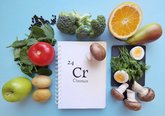 يساعد الكروم في خفض مستويات الدهون الثلاثية وزيادة الكوليسترول المفيد، كما أنه يحسن أيضا حساسية الأنسولين لدى الأشخاص المصابين بداء السكري من النوع الثاني. ويلعب الكروم وهو معدن نادر دورا مهما في طريقة تفكيك الجسم للبروتينات والكربوهيدرات والدهون. ويساعد الكروم أيضا في تحسين صحة القلب والأوعية الدموية، كما أنه يدعم تخفيض الوزن وصحة الدماغ. ويتم تناول الكروم كمكمل غذائي رغم توافره في مجموعة من الأغذية كما في القائمة التالية: