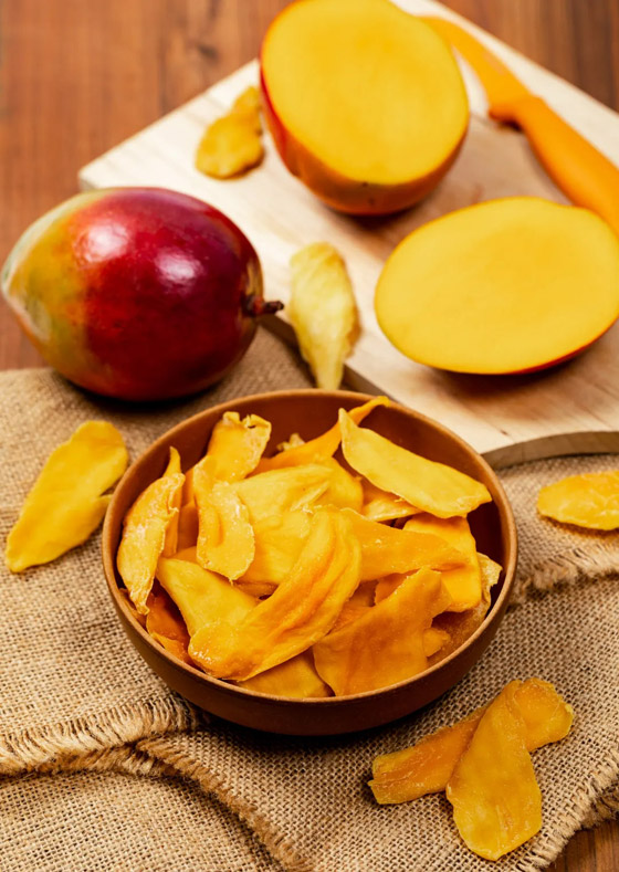 5. المانغو المجفف: من الممكن أن يكون المانغو المجفف بديلا لذيذا وصحيا عن الحلويات، كما يحتوي على نسبة عالية من فيتامين سي والألياف الغذائية.