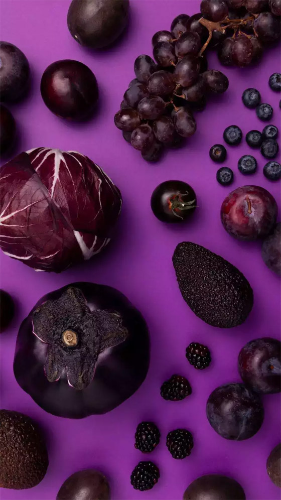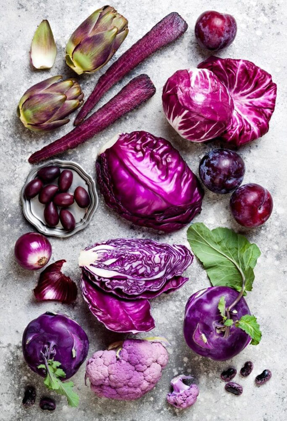 1- مضادة للأكسدة: إن الأطعمة الأرجوانية غنية بالأنثوسيانين، الذي يحارب الجذور الحرة، مما يقلل من خطر الإصابة بالأمراض المزمنة ويبطئ عملية الشيخوخة.