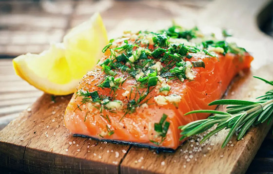 4. سمك السالمون: تحتوي الأسماك الدهنية مثل السلمون على نسبة عالية من أحماض أوميغا-3 الدهنية، وهي مفيدة لصحة القلب ويمكن أن تقلل الالتهاب.