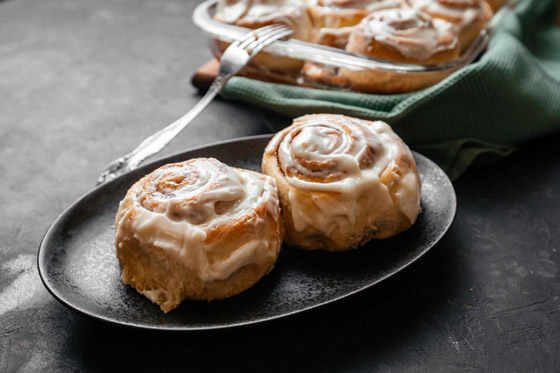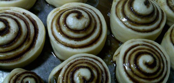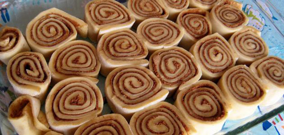 نحضر صينية مدهونة زبد، ونرص بها وحدات السينابون، ثم نغطى الصينية ونتركها لمدة 15 دقيقة.