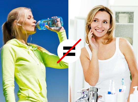 6- بشرتك لن تصبح أكثر صفاءً إذا شربت كمية كبيرة من الماء عليك بالطبع أن تشرب ما يكفي من الماء، لكنَّ الماء في حد ذاته ليس علاجاً لحَب الشباب. تتجدد خلايا البشرة المُرطَّبة جيداً بصورةٍ أسرع، لكن علينا ألا نأمل تقليل كمية حَب الشباب بمجرد شرب كوبٍ إضافي من الماء.
