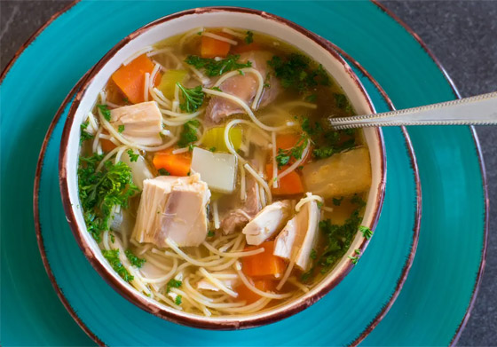 6. شوربة الدجاج: اكتشفت دراسة، أجراها المركز الطبي بجامعة نبراسكا في التسعينيات من القرن الماضي، أن حساء الدجاج هو في الواقع علاج فعال لنزلات البرد. قام الطبيب ستيفن رينارد باختبار وصفة حساء الدجاج الخاصة بجدة زوجته في المختبر، ووجد أن "هناك مكونات في المواد الغذائية الشائعة قد يكون لها تأثير مضاد للالتهابات". أشاد دكتور باريك أيضًا بعلاج نزلات البرد النباتي الذي تم إعطاؤه له عندما كان طفلاً عندما كان مريضًا، موضحًا أنه كان "علاج هندي طبيعي قديم يُعطى من الماء الدافئ والملح والكركم والزبدة ويساعد في تخفيف احتقان الصدر وتهدئة التهاب الحلق وتخفيف السعال".