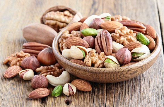 2- المكسرات: يمكن التحكم في الكوليسترول الضار والدهون الثلاثية والكوليسترول الكلي عن طريق تناول المكسرات بانتظام مثل الجوز واللوز والكاجو والفول السوداني والفستق. كما أنها مصدر جيد لأحماض أوميغا 3 الدهنية الضرورية لصحة القلب.