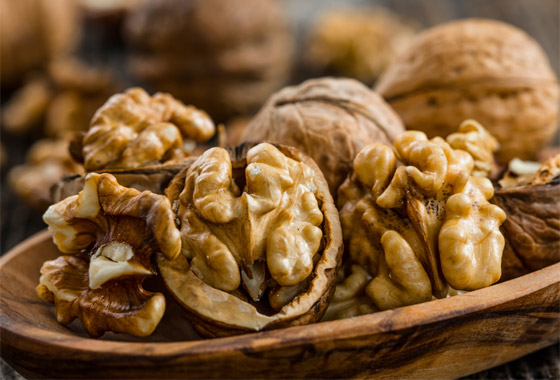 1. الجوز (عين الجمل): يحتوي الجوز (عين الجمل) على نسبة عالية من أحماض أوميغا-3 الدهنية والنحاس، مما يعزز صحة الشعر ويمنع ظهور الشيب مبكراً.