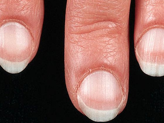 2) أظافر باهتة وهشة: من أكثر المؤشرات التي تدل على نقص الحديد بالجسم هي الأظافر باهتة اللون، وذلك نتيجة لنقص الهيموغلوبين. كما أن بهتان اللون يطال أيضاً الوجه واللسان. كما تكون الأظافر هشة وضعيفة ويسهل تكسرها.