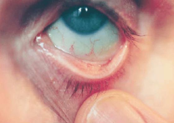 3) صفار أو بياض بالجفن الأسفل: الطبيعي أن يكون لون الجبن الأسفل من الداخل أما أحمر أو وردي، لكن عند الشخص الذي يعاني من نقص الحديد، يميل اللون إلى الصفار أو البياض، نظراً لقلة تدفق الدم في هذه المنطقة.