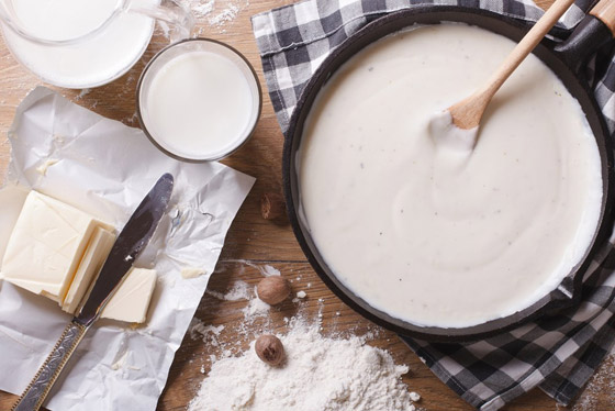 تذوب الزبدة في قدر على النار ثم يضاف الطحين ويقلب على نار متوسطة حتى يتحمص قليلاً، ويضاف الملح والفلفل. يسخن الحليب ثم يسكب بشكل تدريجي فوق مزيج الطحين والزبدة مع الاستمرار في التحريك حتى تغلي البشاميل، نحو دقيقتين.