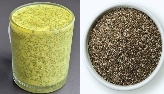 ثم يتم نقع ملعقتي بذور الشيا في وعاء مع 4 ملاعق كبيرة من الماء. في نفس الأثناء، يتم تسخين باقي كمية الماء في مقلاة حتى يصبح دافئًا. ويستمر نقع بذور الشيا لمدة 10-15 دقيقة حتى تشكل قوامًا يشبه الهلام. وبعد غسل الكركم جيدًا، ونزع القشرة الخارجية، يمكن إما بشره الكركم أو تقطعيه جيدًا إلى قطع صغيرة ثم يسحق قليلاً.