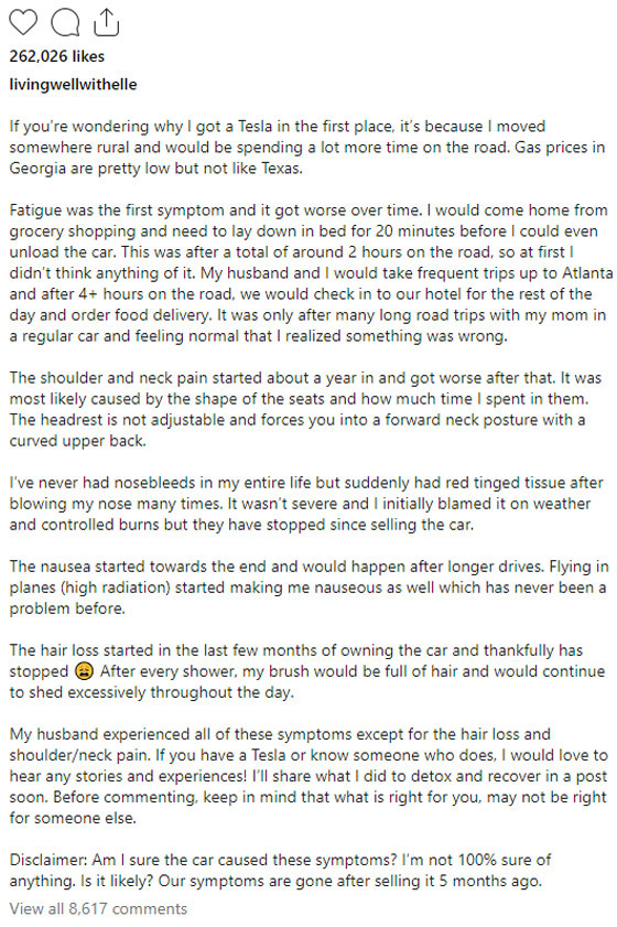 وأفادت مالكة أخرى لسيارة "تسلا" إنها بدأت تشعر بالتعب بعد قيادة سيارتها، واشتكت من أن الأعراض تزداد سوءا بمرور الوقت. وفي منشور على "إنستغرام"، قالت إنها وزوجها أمضيا ساعات في السيارة، وشعر كلاهما بالأعراض نفسها، ولكن لم تدرك أن هناك شيئا خاطئا إلا بعد أن قامت برحلات برية في سيارة والدتها التي تعمل بالبنزين، ولم تظهر عليها أي أعراض. وزعمت أنها بدأت تعاني من نزيف في الأنف وغثيان عند قيادة سيارة "تسلا" لمسافات طويلة، وقالت إنها بدأت تفقد شعرها في الأشهر القليلة الأخيرة من امتلاك السيارة. وأضافت: "لست متأكدة بنسبة 100% من أن الأعراض كانت بسبب السيارة". وعلقت إحدى المتابعات قائلة: "امتلكت موديل Y لمدة 3 سنوات، وأعاني من صداع شديد وآلام في الجسم وتعب طوال الوقت. عندما أشارك تجاربي مع الآخرين لا يصدقونني".