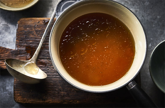 4- مرق العظام: يلعب مرق العظام دوراً مهماً في الحفاظ على صحة البشرة والمفاصل. يتمّ تحضيره عبر غلي العظام ، والغضاريف، والأنسجة الضامة الحيوانية لفترة طويلة مما يُساعد على إطلاق الكولاجين الموجود فيها. لدى تناول مرق العظام يتحوّل الكولاجين إلى أحماض أمينيّة تُستعمل بدورها في إنتاج وترميم الكولاجين داخل جسم الإنسان. وللاستفادة من خصائص مرق العظام، يوصى بإعداده من خلال استخدام عظام عالية الجودة مثل عظام اللحم القري التي تتغذّى على العشب وعظام الدجاج العضويّة...). يمكن تناول هذا المرق كما هو أو استخدامه في الحساء والصلصات، أو حتى إضافته إلى وصفات أخرى لتعزيز قيمتها الغذائيّة.