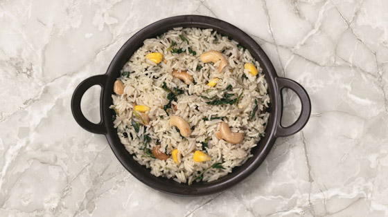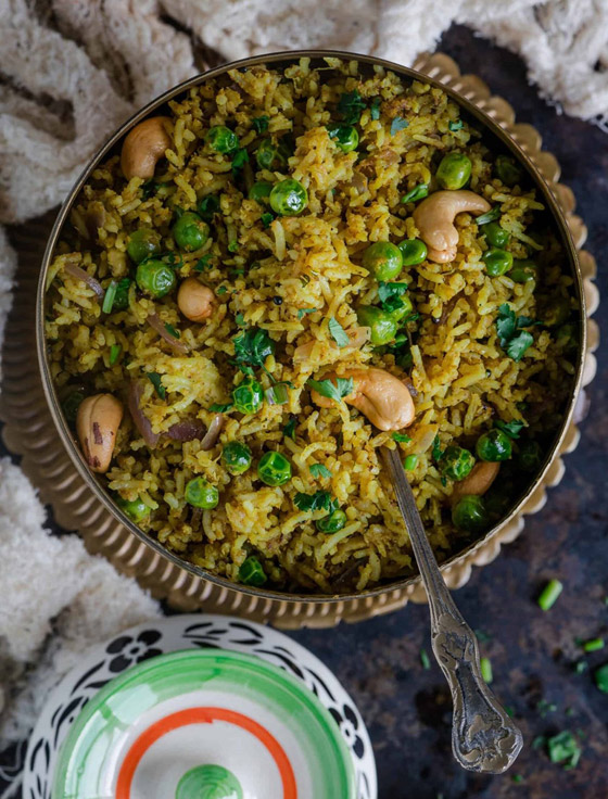 هذا الطبق البسيط والمريح، يجمع: الأرز، والبازلاء الحلوة، وعصير الليمون، ونكهة الكمون العطرية، مع لمسة من الكاجو المقرمش. والنتيجة تكون وجبة شهية، تشعرك بالدفء والراحة، وتمدك بالطاقة والحيوية في الوقت ذاته، فالأرز والسمن والكاجو أطعمة غنية بـ«الأوجاس» (أي طاقة الحياة في «الأيورفيدا»)، ما يعزز المرونة والصحة العامة. كما أن السمن يلين الجسم من الداخل، بينما الليمون والملح يدعمان ترطيبه. أما الكمون والكركم والخردل، فتحفز الجهاز الهضمي، وتساعد على توازن المكونات الثقيلة مثل الكاجو.