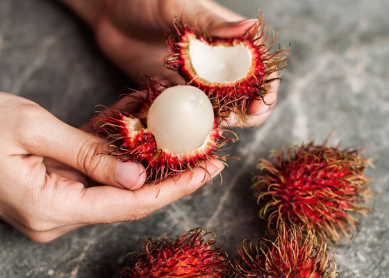 فاكهة الرامبوتان من فصيلة الليتشي واللونجان، تعود أصولها إلى جنوب شرق آسيا، وهي ذات قشرة مشعرة ولحم حلو ذات لون كريمي ومذاق حلو لذيذ. الرامبوتان فاكهة مغذية جداً ومنخفضة السعرات الحرارية، من هنا يمكنها دعم عملية الهضم وجهاز المناعة وفقدان الوزن. فاكهة الرامبوتان غنية بالفيتامينات والمعادن والمركّبات النباتية المفيدة. اكتشفي مع اختصاصية التغذية عبير أبورجيلي، عيادة Diet of the Town، فوائد فاكهة الرامبوتان على الصحة في الآتي: