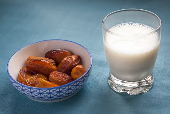 2- الحليب والتمر: هذا من أفضل المشروبات التي يجب أن نحرص عليها خلال وجبة الإفطار. فيمكننا أن ننقع حبات من التمر في كوب من الحليب منزوع الدسم ونتركها حوالي 12 ساعة، ثم نستهل وجبة الإفطار بهذا المشروب المفيد والغني، الذي يعطينا الطاقة ويحافظ على المستوى المعتدل للسكر في الدم، والذي عادة ما ينخفض خلال ساعات الصيام.