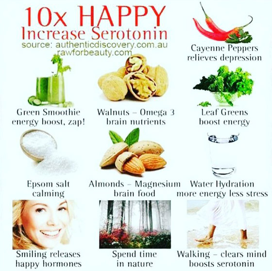 توجد داخل جسم الإنسان العديد من الهرمونات، التي يكون لكل منها مهام محددة، ومنها هرمون السيروتونين، الذي يمنح الإنسان شعورا بالسعادة ويساهم في تحسين المزاج. يتكون هرمون السيروتونين من مادة كيميائية، ويعمل كناقل عصبي تتبادله النهايات العصبية في الدماغ، ويتطلب إنتاجه داخل الجسم تناول أطعمة تحتوي على حمض التريبتوفان الأميني، الذي يمكن الحصول عليه من نظام غذائي يحتوي على المكسرات، والجبن، واللحوم الحمراء.