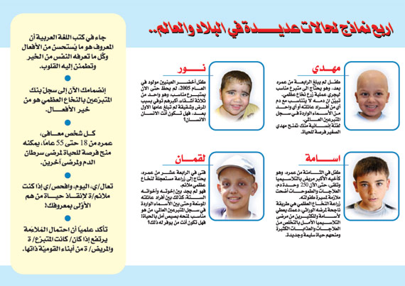 يذكر أن زراعة النخاع العظمي هي علاج ناجح لسرطان الدم وأمراض وراثية كالتلاسيميا ونقص المناعة. وتدل الإحصائيات العالمية على ان ما يقارب من 70% من المرضى اللذين هم بحاجة لزراعة نخاع عظمى لا يوجد متبرّع مناسب في العائلة. لهذا أنشئت مجمّعات المتبرّعين في انحاء العالم، وهي تضم ما يزيد عن 12 مليون متبرّع.واقيم في مستشفى هداسا مجمّع المتبرّعين بالنخاع العظمي لإجل العثور على متبرعين للمرضى المحليين، بعد ان اثبت أن تصنيف الأنسجة يختلف بين أبناء القوميات المختلفة. ويضم مجمّع مستشفى هداسا 63،000 متبرع محتمل من بينهم ما لا يزيد عن 150 متبرعا عربيا.لأجل تغيير هذا الوضع فأن مجمّع المتبرّعين بالنخاع العظمي في هداسا وضع له هدفا بان يزيد بشكل ملحوظ عدد المتبرّعين العرب في المجمّع . وبناء على ذلك أطلق مشروعا خاصا، هو الاول من نوعه في العالم العربي، تديره الدكتورة أمال بشارة بدعم من البروفيسور حاييم براوطبر، مؤسس سجلّ المتبرعين بالنخاع العظمي الأول في البلاد والدكتورة شوشانه يسرائيل، مديرة مختبر تصنيف الأنسجة في هداسا.