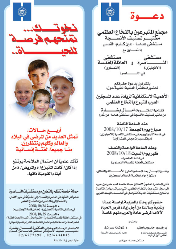 يلي تقديم المحاضرة، في الأسبوع القادم، تنظيم يومين لتسجيل المتبرعين، وذلك بالتعاون مع مستشفيات الناصرة، حيث سيكتمل التعاون مع مستشفى الناصرة والعائلة المقدسة بتعاون اضافي مع المستشفى الفرنسي، في نهاية تشرين الثاني القادم.