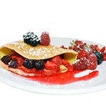 12- يوزع مزيج الفاكهة على سلات الكريب وينثر برش البرتقال في الأعلى وتقدم -