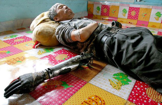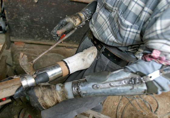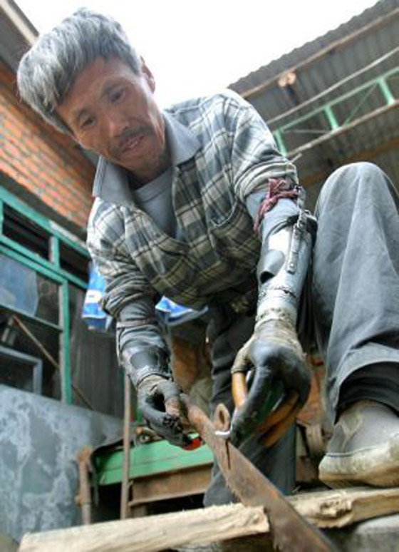 بعد طول صبر وعناء، نجح مزارع صيني، فقد ذراعيه في انفجار قنبلة لصيد السمك، في صنع أطراف اصطناعية بعد عجزه عن شرائها من المستشفى. ويذكر ان كان المزارع الصيني "سان جيفا" (51 عاماً) من محافظة جيلين بشمال الصين، يعمل في تصميم متفجرات لصيد الأسماك، فانفجرت إحداها دون سابق إنذار وتسببت في بتر ذراعيه، ونقل على أثرها إلى المستشفى للعلاج.