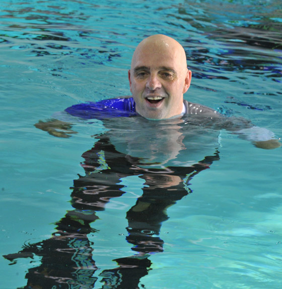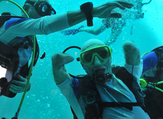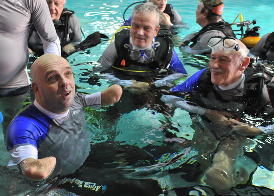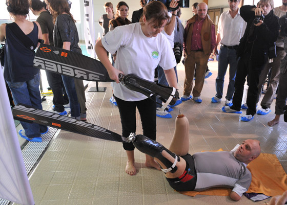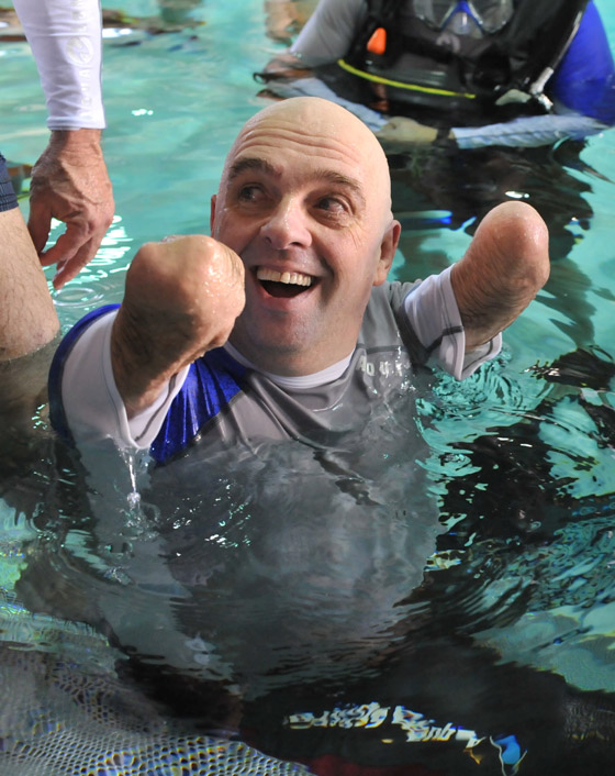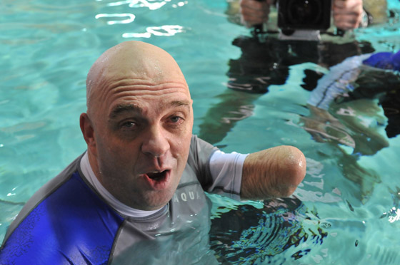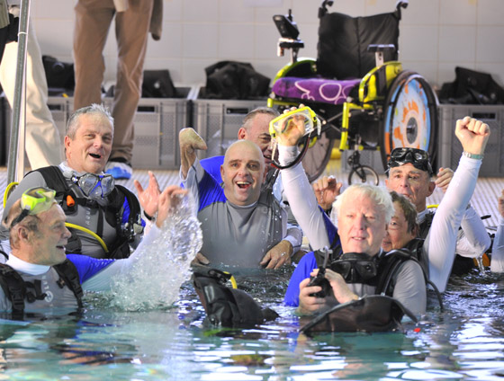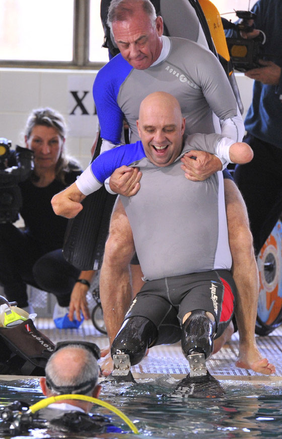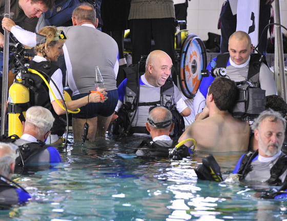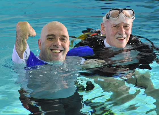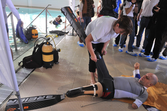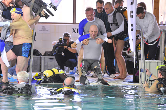 الغواص الفرنسي فيليب كرويزون الذي فقد ذراعيه وساقيه في حادث صدمة كهربائية عام 1994، يسبح بجانب زميله في أعمق بركة سباحة في العالم ببروكسل، حيث حطم الرقم القياسي بكونه أول شخص يغوص بعمق 33 مترا حوال الـ 100 قدم.