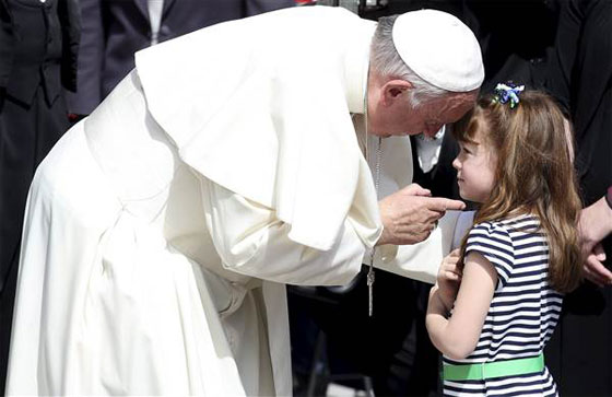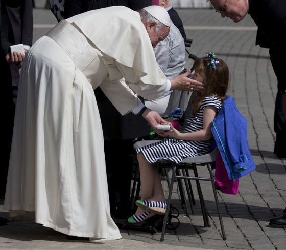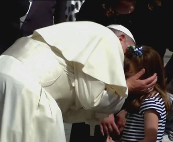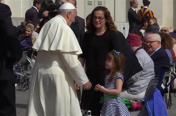 التقى البابا فرنسيس في ساحة القديس بطرس في الفاتيكان، بالطفلة إليزابيث مايرز البالغة من العمر 5 أعوام، والتي تعاني من مرض جيني نادر سيفضي عاجلا أم آجلا إلى فقدان بصرها نهائيا. وبارك البابا فرنسيس الطفلة أمام حشد من البشر الذين اجتمعوا في ساحة القديس بطرس في الفاتيكان، في إطار فعالية أقامتها منظمة UNITALSI غير التجارية التي تهدف إلى تقديم العون لذوي الاحتياجات الخاصة. وكان الهدف من هذه المبادرة، هو أن ترسخ في ذاكرة الطفلة التي ستفقد بصرها عاجلا أم آجلا، ذكريات جميلة عن العالم الذي حولها قبل أن تفقد حاسة البصر إلى الأبد.