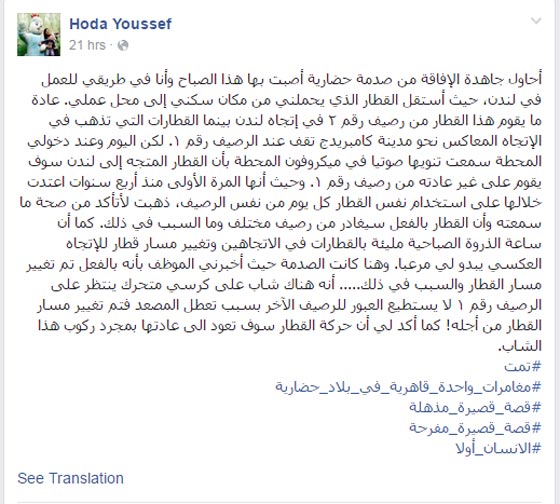 وتداول رواد موقع فيسبوك من المصريين هذه القصة وتساءلوا من خلالها عن حال مصر في التصرف في مواقف مشابهة. وجاء القصة التي روتها المواطنة المصرية هدى يوسف المقيمة في لندن عبر صفحتها على فيسبوك كالتالي: