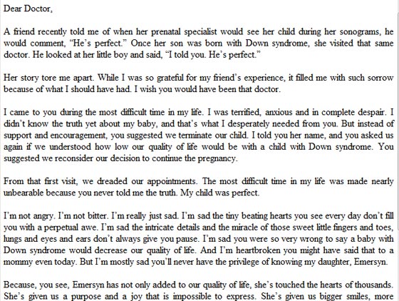 وفي الرسالة، قالت الأم كونتري للطبيب: أشعر بالحزن حيال ما قلته لي بأن طفلتي المصابة بمتلازمة داون ستجعل حياتي وحياة زوجي شاقة وغير سهلة. وسأكون مكسورة القلب إن قلت الكلام نفسه لأمهات آخريات، لكن ما يشعرني بالحزن الأكبر هو أنك لن تحظى بفرصة معرفة طفلتي الرائعة إيمي.