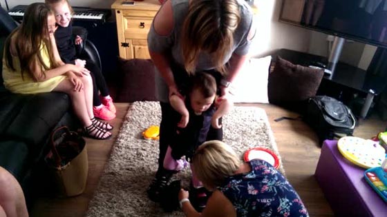 استطاعت طفلة السير لأول مرة كأشقائها الأكبر سنا وهي في الثالثة من عمرها عن طريق ربطها بوالدتها. وأصيبت الطفلة "هوب واتسون" بحالة نادرة أفقدتها القدرة على السير ولكن يمكنها الوقوف فقط، وتعرف تلك الحالة بمتلازمة "أودو". تمكنت الطفلة التي تعيش بنيوكاسل من السير أخيرًا ولأول مرة بعد ربطها بأقدام والدتها ميشيل في لقطات مؤثرة.