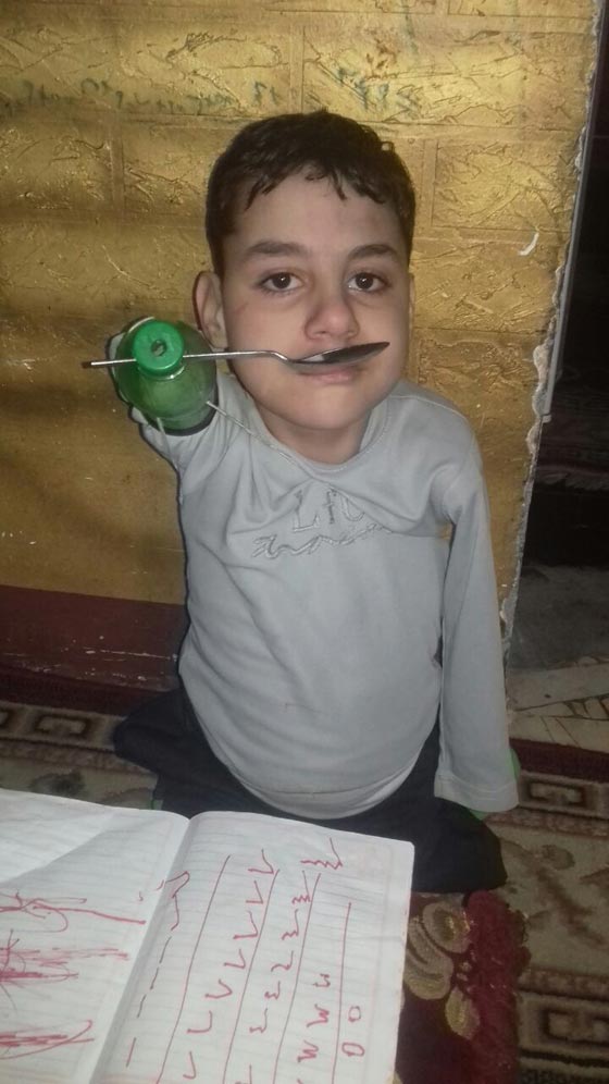 وأكد الوالد أن ابنه أصبح الآن في الصف الثاني الابتدائي رغم عمره الكبير، فقد كان من المفترض أن يكون في الصف الخامس حاليا، لكن نظرا لتأخر نطقه وصعوبة إخراجه للحروف والكلمات وغياب أطرافه التحق بالمدرسة متأخرا. وتابع: "لكن لديه إرادة فولاذية، فهو يرغب في التعلم ولديه قدرة كبيرة على الاستيعاب والفهم"، مشيرا إلى أن لديه أملا في أن يرى ابنه يوما قادرا على الحركة والمشي وممارسة حياته بشكل طبيعي.