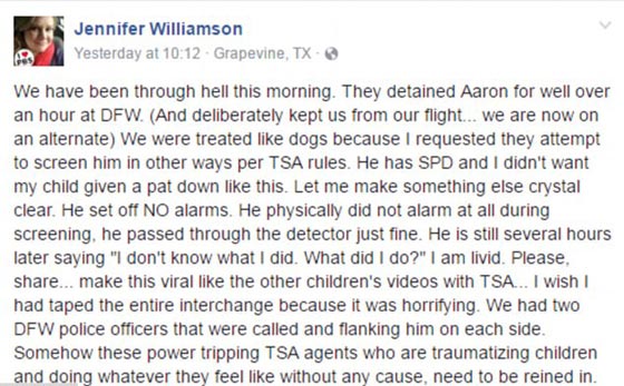 التقطت امرأة مقطع فيديو مروعا لحارس بشركة حراسة بمطار دالاس، بولاية تكساس يفتش طفلها المعاق بشكل مريب مما ترك طفلها في حالة من الصدمة لساعات. وصورت "جينيفر وليامسون" ابنها آرسون أثناء تفتيشه من قبل الحارس وأكدت أنها طلبت تفتيشه بطريقة أخرى مراعاة لكونه معاقا، وأن إعاقته تلك تجعله غير مرتاح عندما يلمسه الآخرون، كما احتجزا لوقت طويل بعد طلبها منهم احترام حالته.