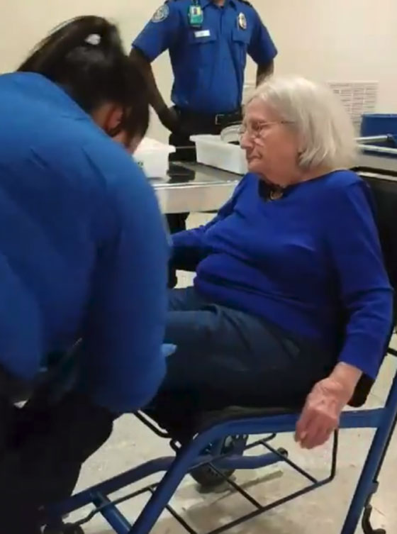 قام عناصر الأمن في مطار أمريكي بعملية تفتيش "تعسفية" ومبالغ فيها، استهدفت جسد عجوز مسنة ومقعدة (96 سنة) كانت تسافر بصحبة ابنتها، ما أثار غضبا واشمئزازا واسعين في الولايات المتحدة. وقام العناصر بتفتيش السيدة العجوز في مطار "ديولس" الأمريكي أمام ابنتها وأمام جميع الركاب في صالة المغادرة، بل حتى أنهم فتشوا كرسيها المتحرك ولمرات عدة.