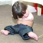 وتضيف وهي تعرض في بيتها لقطات تسجيلية مصورة لطفلها لدى محاولته صعود الدرج ونزوله، وتناوله الفواكه بـ "الشوكة" وتحدثه بواسطة الهاتف الخليوي وتأرجحه لوحده يعتمد علي في حركته اليومية على بطنه ورأسه ورجليه برغم قصر إحداها بسبب ولادته بلا عظم الفخذ، وتقول ان له قدرة فائقة على ضم الأشياء بين أصابع رجليه والتحكم بها كقيامه بضم القلم.