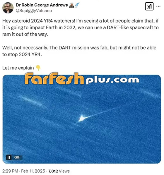 ففي الوقت الحالي، لا يعرف العلماء الحجم الدقيق لـ 2024 YR4، أو حتى ما إذا كان كويكباً من الأنقاض أيضاً ولكن ضرب الكويكبات من الأنقاض بمركبة فضائية مثل DART يمكن أن يولد سحابة من الحطام يمكن أن تتجه نحو الأرض على أي حال. أما إذا كانت نقطة اصطدامه في وسط الصحراء، أو في المحيط، فلن "يؤذي أحدا"، ولكن إذا ضرب بلدة أو مدينة، فسوف "يدمر الكثير منها"، وفق عالم البراكين أندروز.