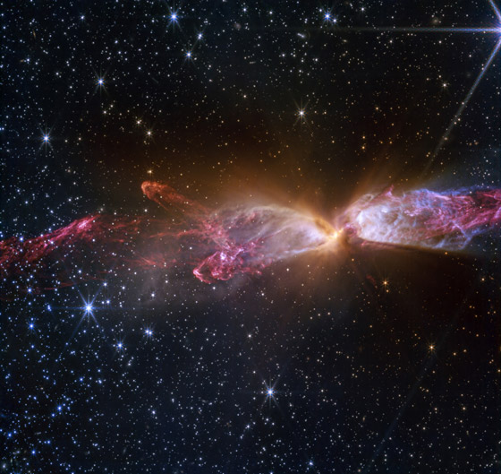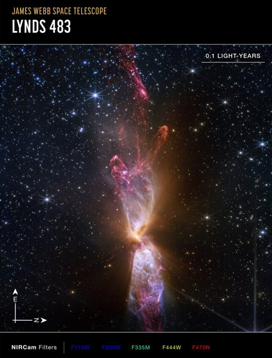 ويختبئ نجمان أوليان فتيان، يبعدان عن بعضهما نحو 650 سنة ضوئية، في قلب "ليندز 483"، النجوم صغيرة في الصورة، لكنها موجودة، وتُظهر وجودها من خلال محيطها. ويتميز "ليندز483"، بسحب كثيفة من الغاز والغبار، التي تُشكل عوائق أمام الرصد في الضوء المرئي، وصُمم وبُني تلسكوب "جيمس ويب" الفضائي لرصد أهداف كهذه، فجميع النجوم، بما في ذلك النجوم الأولية مثل تلك الموجودة في "ليندز 483"، تدور، وعندما تجذب هذه النجوم الغاز والغبار نحوها، تُشكل المادة قرص تراكم دوّاما حول النجم.