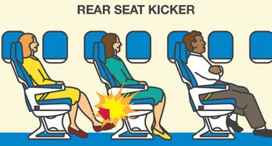 الركل بشكل غاضب: وتصدر هذا الفعل قائمة "أكسبيديا" لتصرفات المسافرين المخالفة للآداب على متن الطائرة في العام 2014. وقال حوالي 67 في المائة من الأشخاص الذين شملهم الاستطلاع أن الركل على المقعد الخلفي يعتبر مزعجاً جداً.