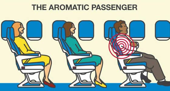 الرائحة المزعجة: وتتسبب الرائحة المزعجة لبعض الركاب بالتسبب بإزعاج المسافرين بنسبة 56 في المائة.